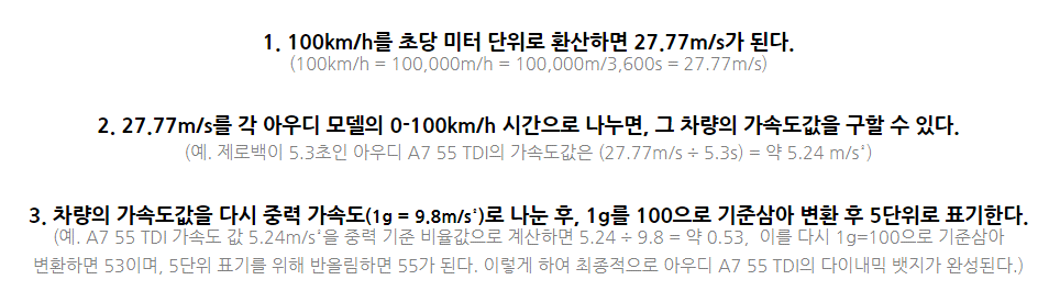예를 들어, 아우디 A7 55 TDI 콰트로는 중력 가속도 1g를 100으로 볼 때, 차량의 가속 성능이 55에 달하는 엔진 차량이라는 뜻이다.