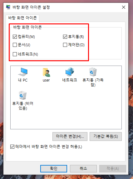4. 바탕화면에 필요한 아이콘을 생성할수 있습니다.