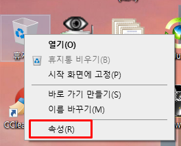 휴지통 아이콘 > 마우스 우클릭 > 속성을 클릭합니다.