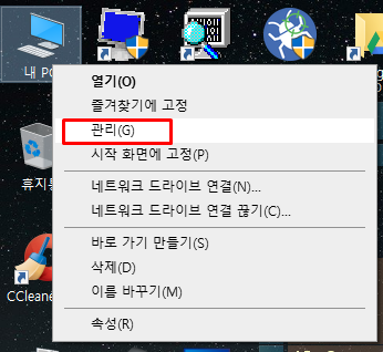 먼저 내컴퓨터 > 우클릭 > 관리 페이지로 이동합니다.