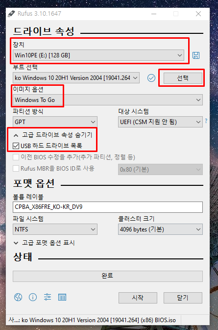 rufus 프로그램을 이용한 윈투고(Windows To Go) 만들기