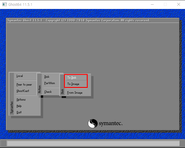 Local > Disk > To Image : 디스크 내용을 이미지 파일로 만들어 백업함 (*.GHO)
