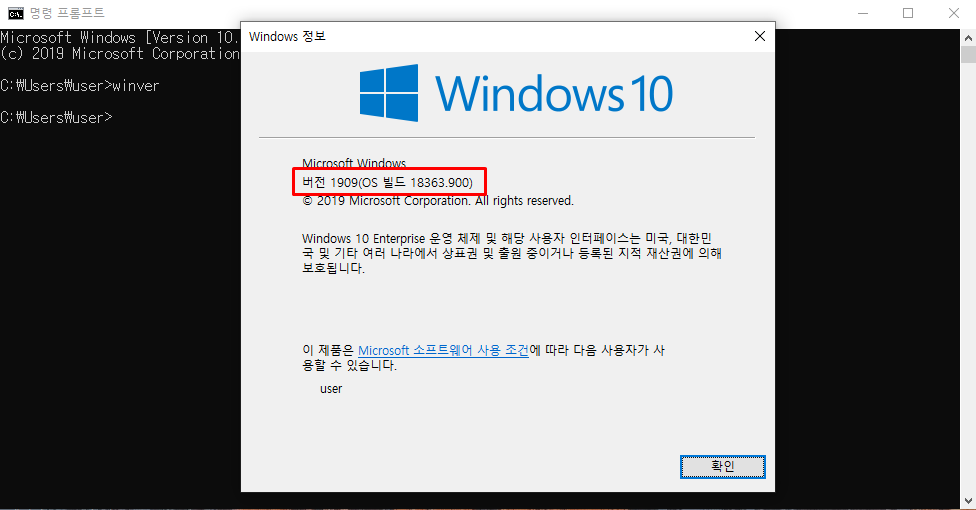 명령 프롬프트에서 winver 명령어로 확인할 수 있습니다.
