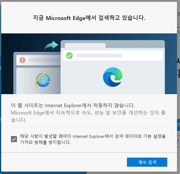 최근 Microsoft Edge 버전부터 IE가 호환되지 않는 사이트를 방문하면 브라우징 세션이 Microsoft Edge에서 자동으로 실행되어 계속하여 엣지 브라우저에서 브라우징 세션이 진행됩니다.