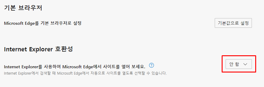 5. Internet Explorer 호환성 옵션을 '안함'으로 변경합니다.