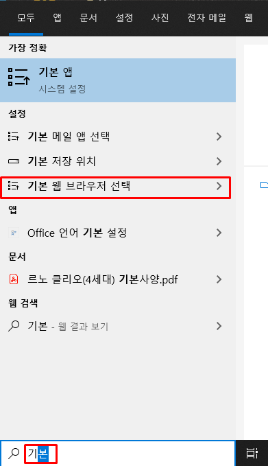 검색창에서 "기본"만 입력 하면 기본 웹 브라우저 선택 메뉴가 나옵니다. 여길 클릭 합니다.