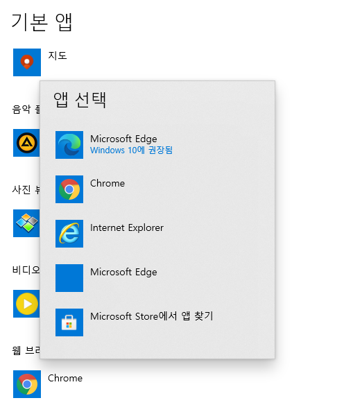 업데이트 이후 기본 브라우저가 변경되는 경우가 있으니 아래 방법으로 간단하게 원하는 브라우저로 변경하시기 바랍니다.