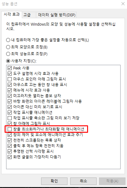 2-4 사용자 지정 - 창을 최소화하거나 최대화할 때 애니메이션 - 체크 아웃 (끕니다)
