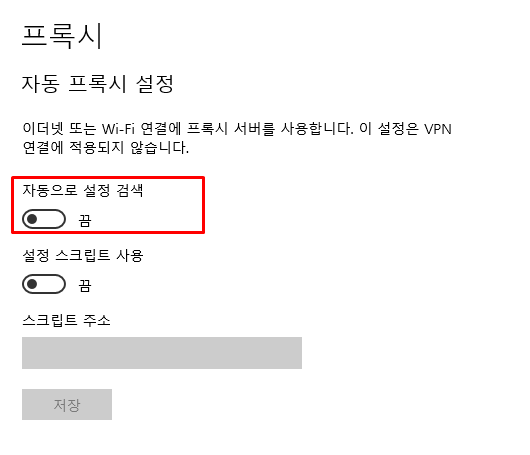 1-2. 프록시 '자동으로 설정 검색' 옵션을 끕니다.