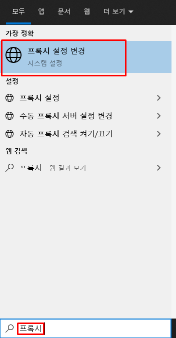 1-1. 인터넷 창 빨리 열기 - 검색창에 '프록시' 라고 입력합니다.