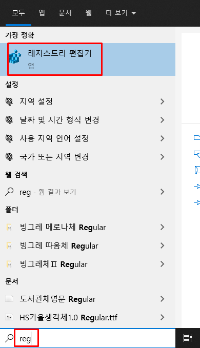 1. 검색 창에 regedit 또는 reg 만 입력하면 레지스트리 편집기가 표시됩니다. 레지스트리 편집기 실행 합니다