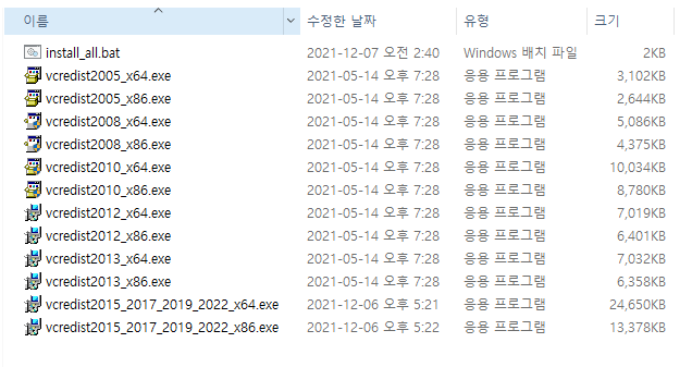 이 아카이브에는 포함된 배치 파일 설치 프로그램을 실행하여 클릭 한 번으로 설치할 수 있는 모든 VCRedist Visual Studio C++ 런타임의 최신 버전(2021년 12월)이 포함되어 있습니다.