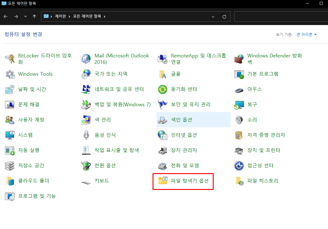 제어판 > 파일 탐색기 옵션으로 이동합니다.
