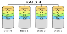 - 모든 파일은 블럭으로 쪼개지고 각 블럭은 여러 디스크에 저장되지만 균등하진 않다. RAID 3처럼 RAID 4도 패리티를 처리하기 위해 별도의 디스크를 사용한다. 동시 트랜잭션 사용량이 많은 시스템에서 읽기 속도는 매우 중요한데 이런 시스템에 적합하다.