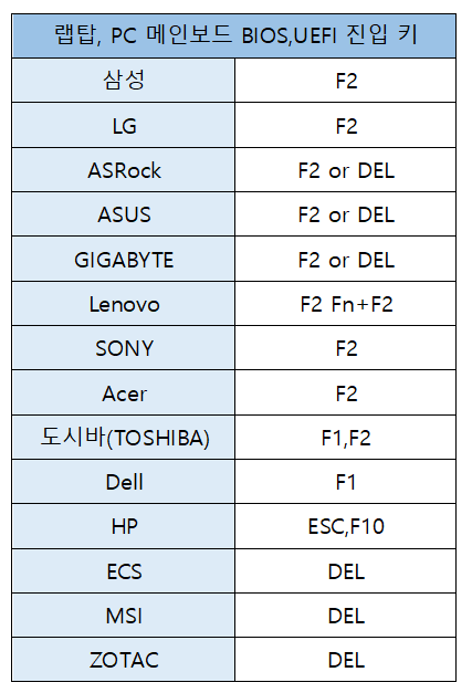 | PC, 랩탑 제조사별 부트(Boot)메뉴 진입키 (0) | 2020.01.29 |