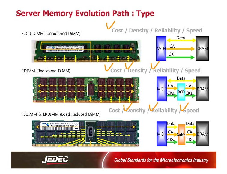 - RDIMM(Buffered (Registered) DIMM) - 메모리에 버퍼(레지스터)를 추가하여 관리한다. 에러 보정 기능을 지원한다. (대부분 서버용)
