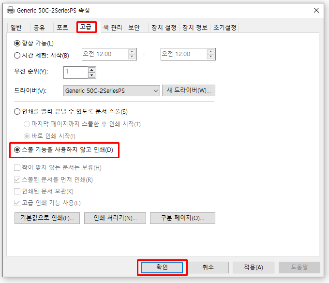 고급 탭에서 "스풀 기능을 사용하지 않고 인쇄" 옵션 변경후 "확인" 후 PC 리부팅 해줍니다.