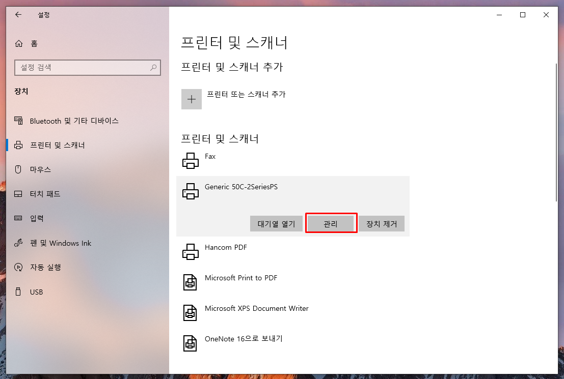 프린터 및 스캐너 클릭