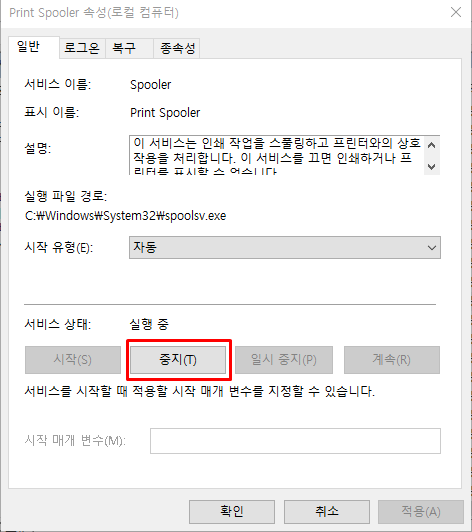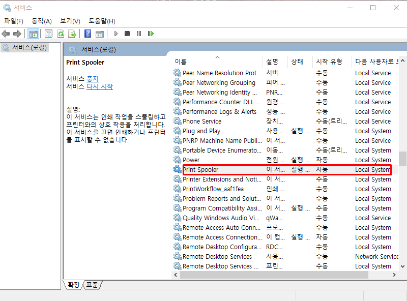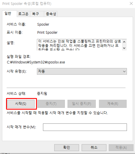 다시 Print Spooler 서비스를 시작해줍니다. 그 후에 PC 리부팅하시면 끝.