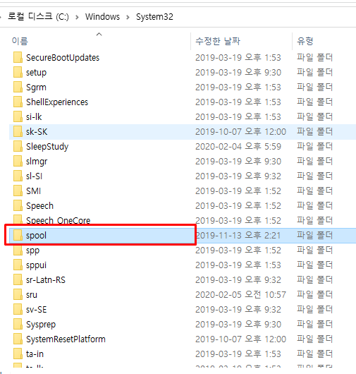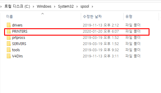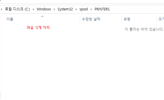 그리고 탐색기를 열러 "c:\windows\system32\spool\PRINTERS" 로 이동합니다.